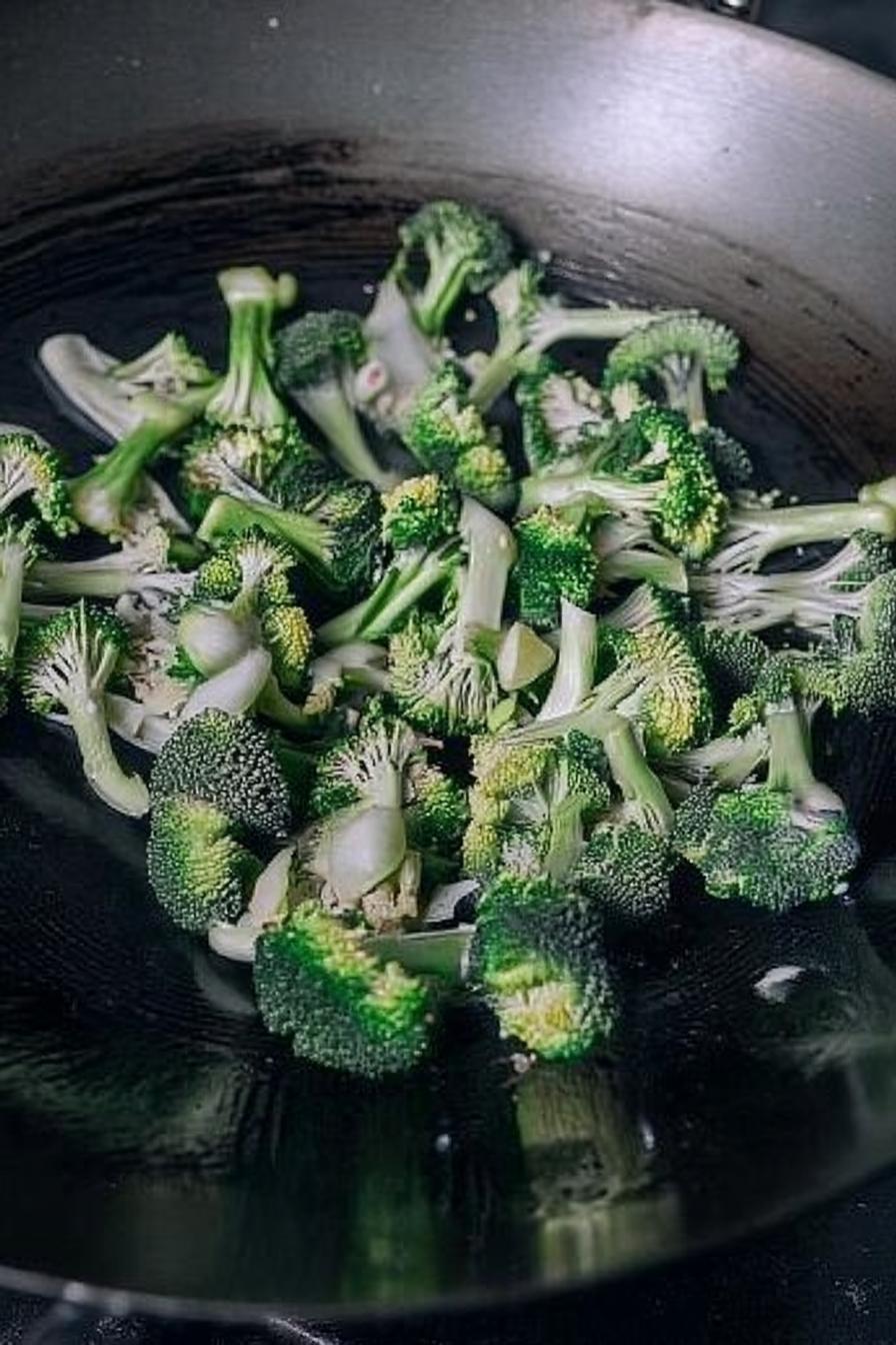 • Heat the wok over high heat. Add the vegetable oil, garlic, and broccoli and quickly stir-fry so the garlic doesn’t burn.