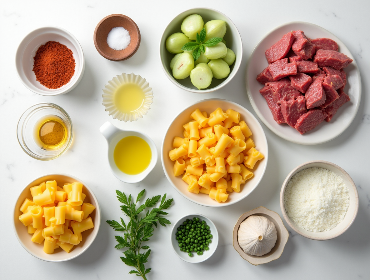 Ingredients for Cheesy Beef and Bowtie Pasta in Garlic Butter: