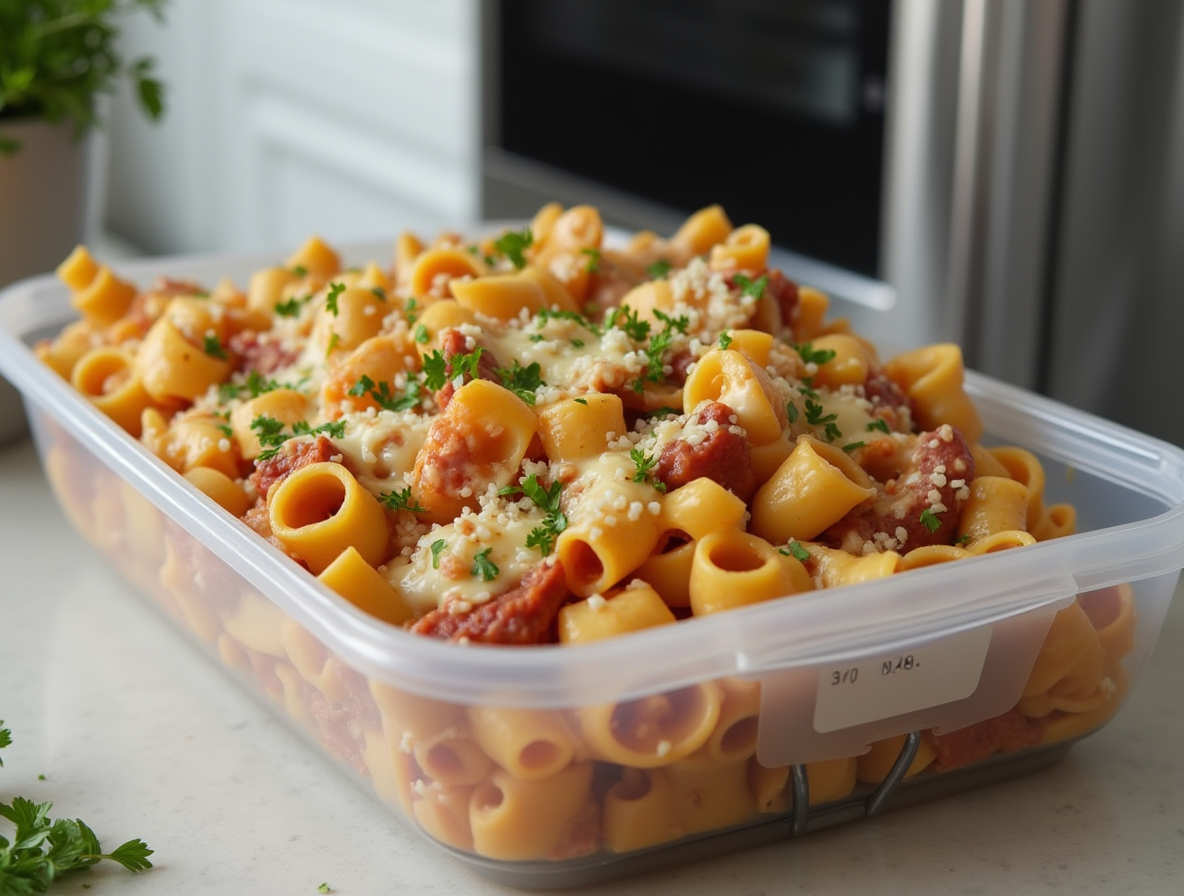 Store the airtight container in the refrigerator if you plan to eat the pasta within a few days. Ensure the refrigerator temperature stays below 40°F (4°C) to maintain food safety. If you want to keep the dish for a longer period, consider freezing it. When freezing, use freezer-safe containers or resealable plastic bags, and expel as much air as possible to prevent freezer burn. Label the containers with the date for easy tracking.