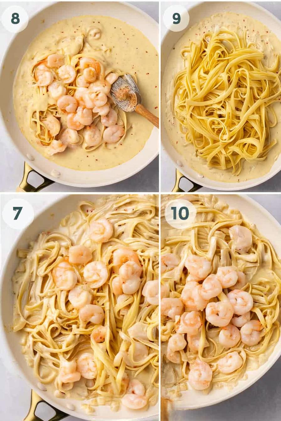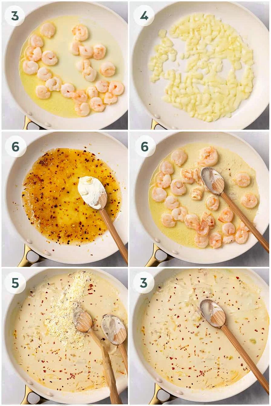- While the noodles are cooking, melt butter in a large skillet over medium-high heat. Once it’s foamy, sauté the shrimp for about 3–4 minutes until they are pink and just cooked through. Remove them from the pan and set aside.