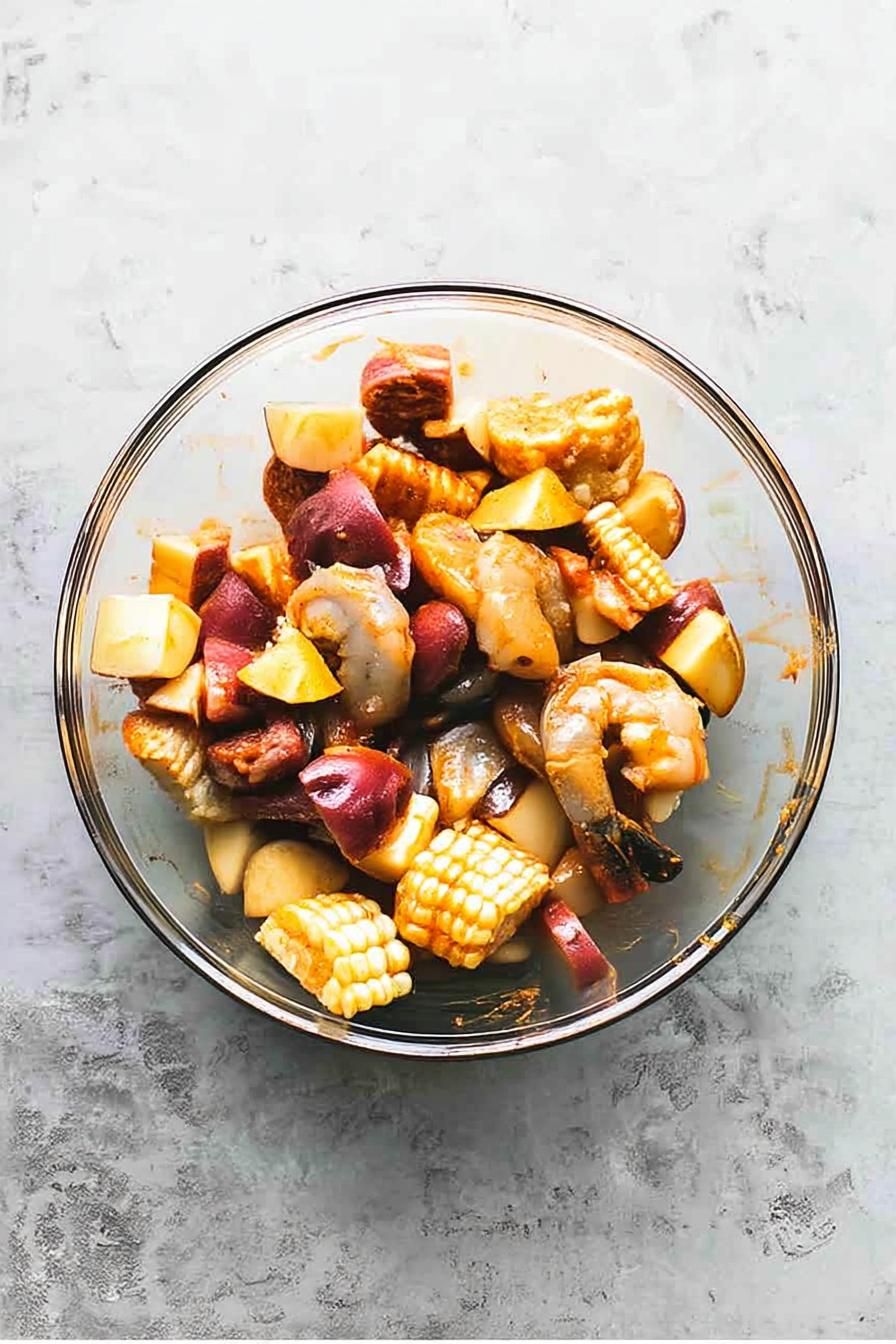 - In a large bowl, combine peeled shrimp and chopped sausage with boiled corn and potatoes. Pour in melted butter, Old Bay seasoning, minced garlic, and juice from half a lemon, mixing thoroughly.