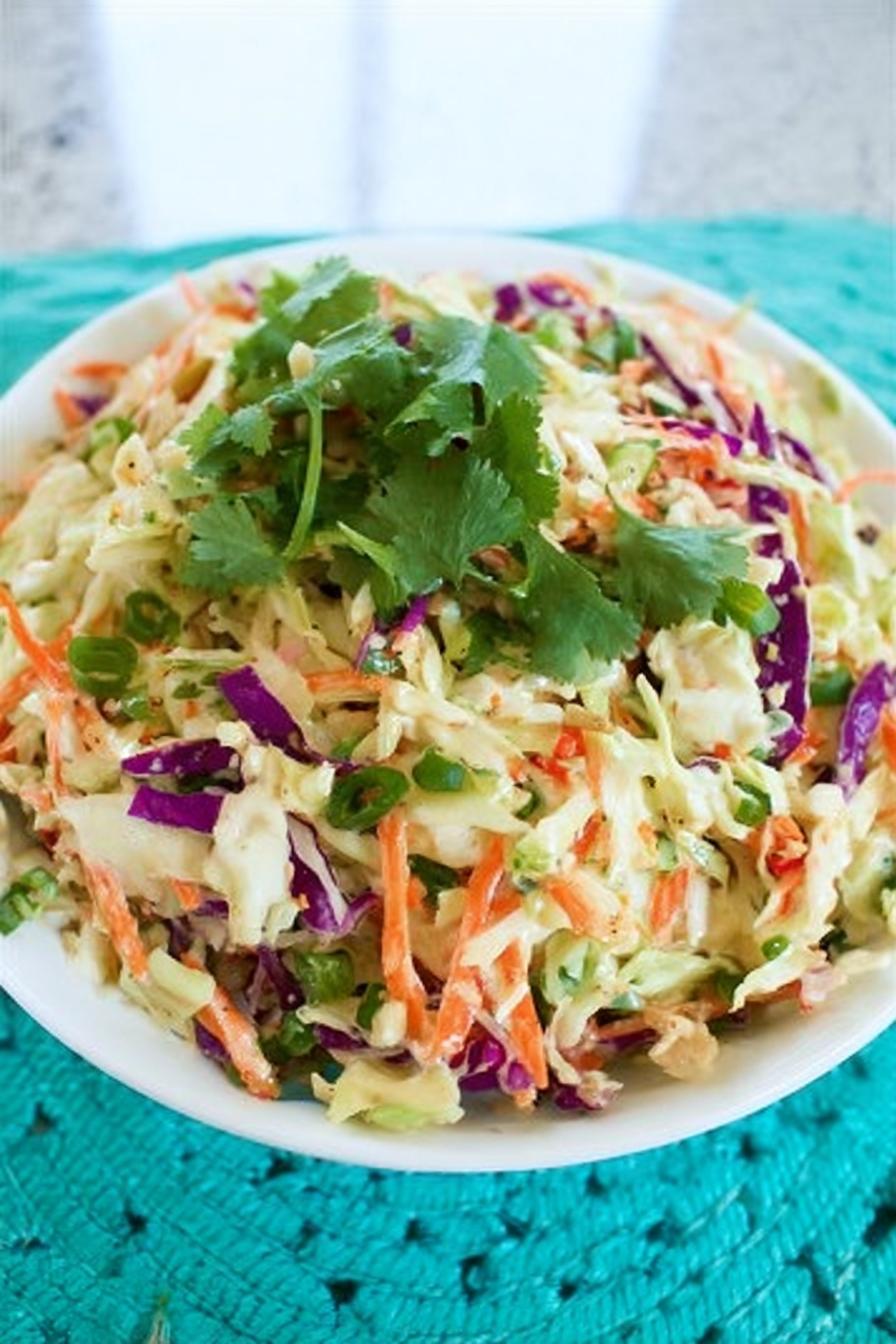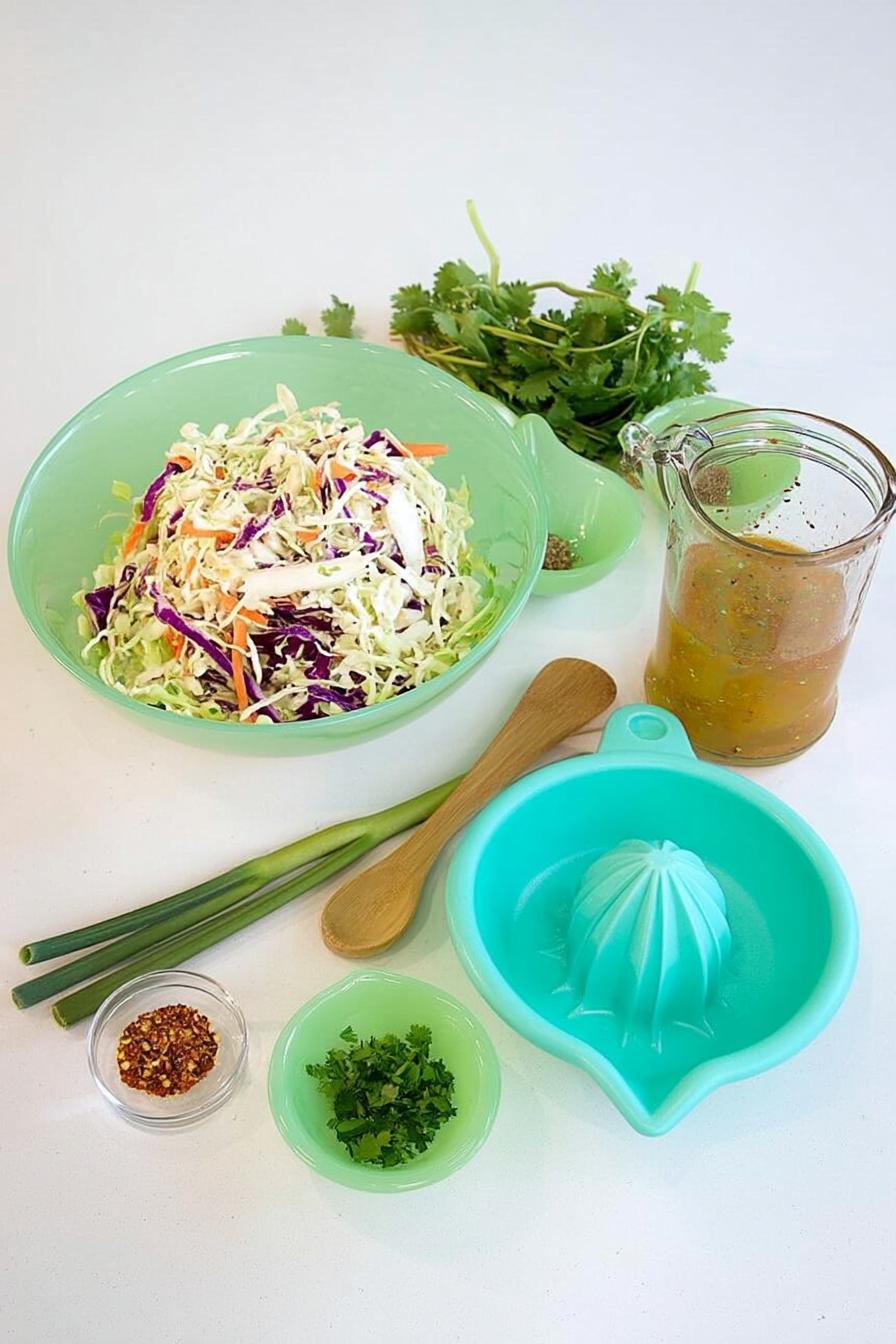 - Toss together the coleslaw mix, chopped cilantro, and minced green onion in a large bowl.
