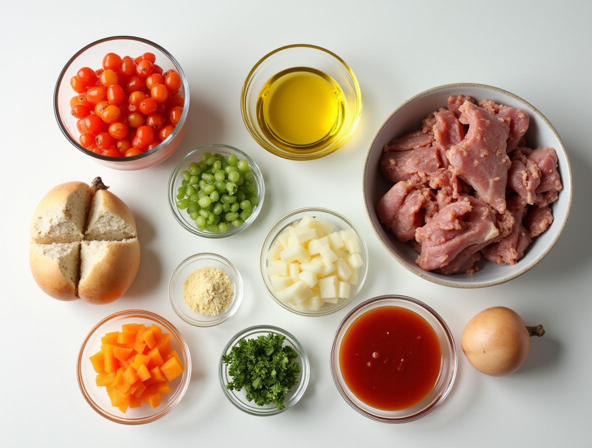 Start by gathering all the necessary ingredients. You will need beef stew meat, potatoes, carrots, bell peppers, canned tomatoes, and various spices.