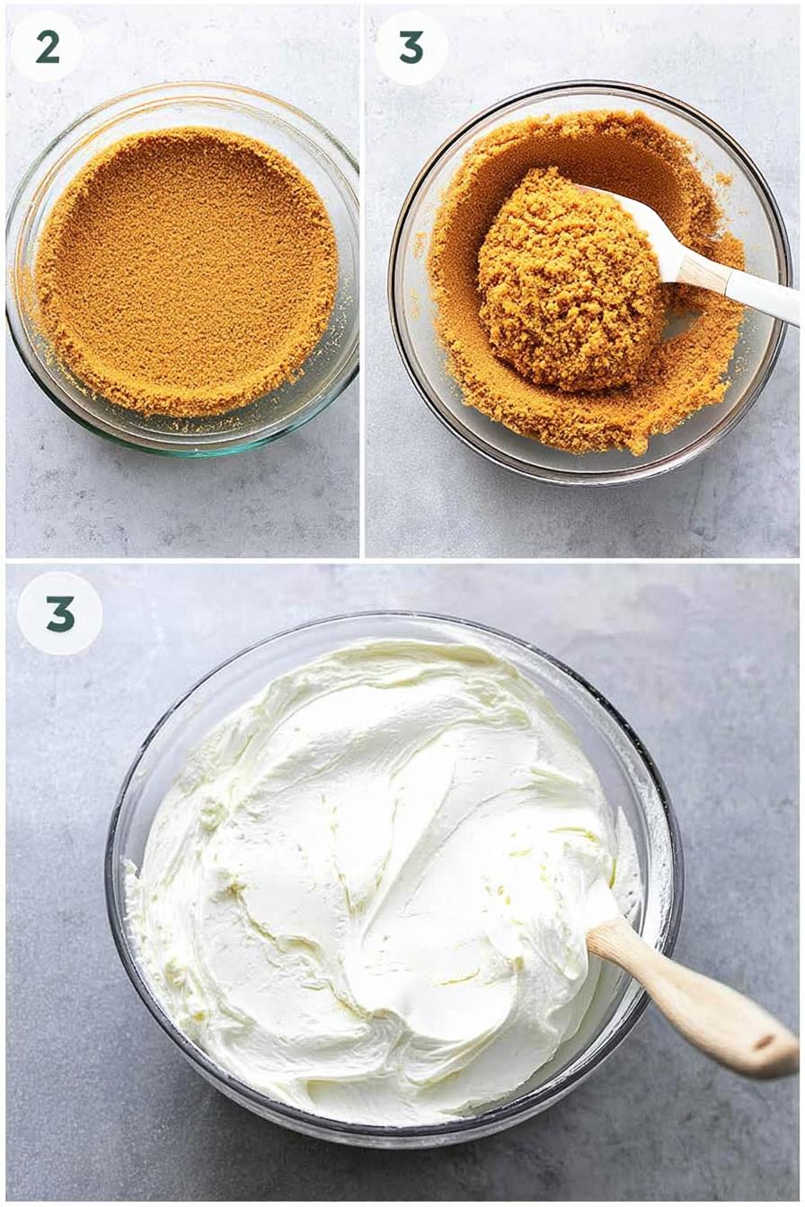 - Begin by preheating your oven to 350°F. Once ready, mix graham cracker crumbs, packed brown sugar, and melted butter. Press this mixture gently into the bottom of a 9-inch springform pan until compact.