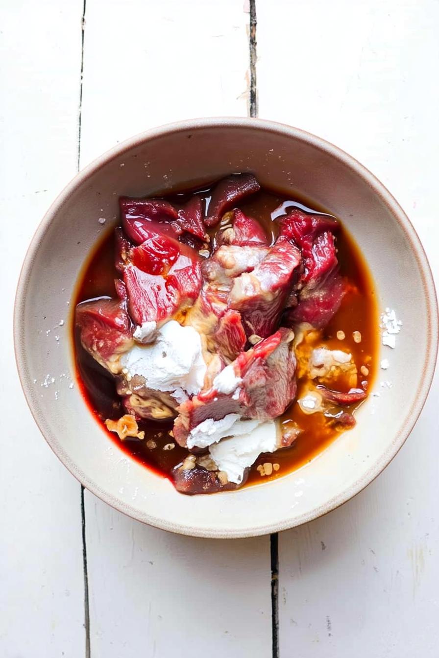 1. Begin by slicing the venison thinly against the grain and place in a mixing bowl. Combine it with cornstarch, 1/4 cup soy sauce, 1 tablespoon rice wine vinegar, and minced garlic. Allow it to marinate in the fridge for 1 hour to overnight for flavor absorption.