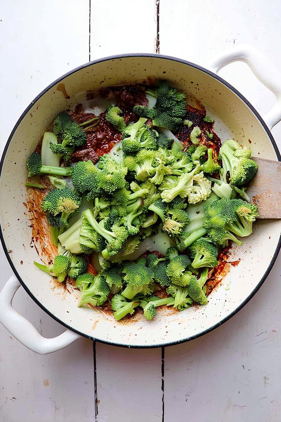 • Add remaining oil to the skillet. Add broccoli and onions and cook for 3 minutes to start to soften.